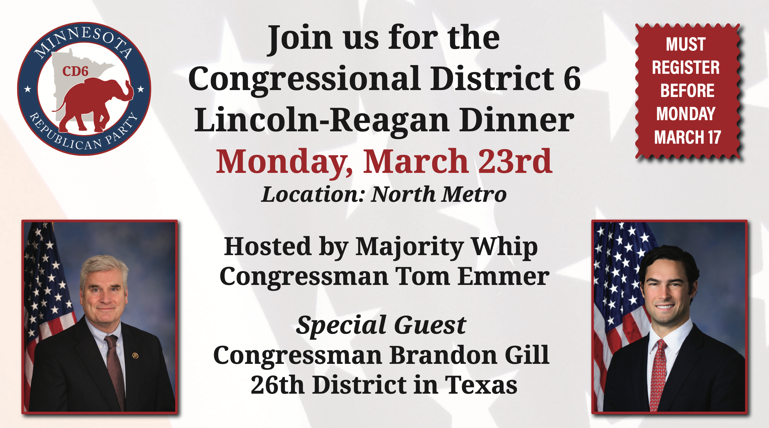 A bastion of common sense conservatism, Minnesota’s Sixth Congressional District has been represented by the GOP for over 70 of its 114 years in existence. With leadership from Congressmen like Charles Lindbergh, Harold Knutson and Vin Weber, to Rod Grams, Mark Kennedy, Michele Bachmann, and today, Congressman Tom Emmer, the 6th has been in the forefront of the movement to protect our natural rights and ensure the continued prosperity of our great nation.